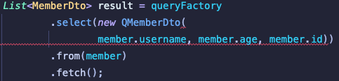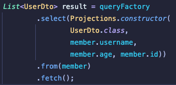 List<MemberDto> result = queryFactory .select(new QMemberDto(member.username, member.age)) .from(member) .fetch();projection이기에 select 부분만 보면 된다. QueryDsl의 Q 파일을 사용한다.
